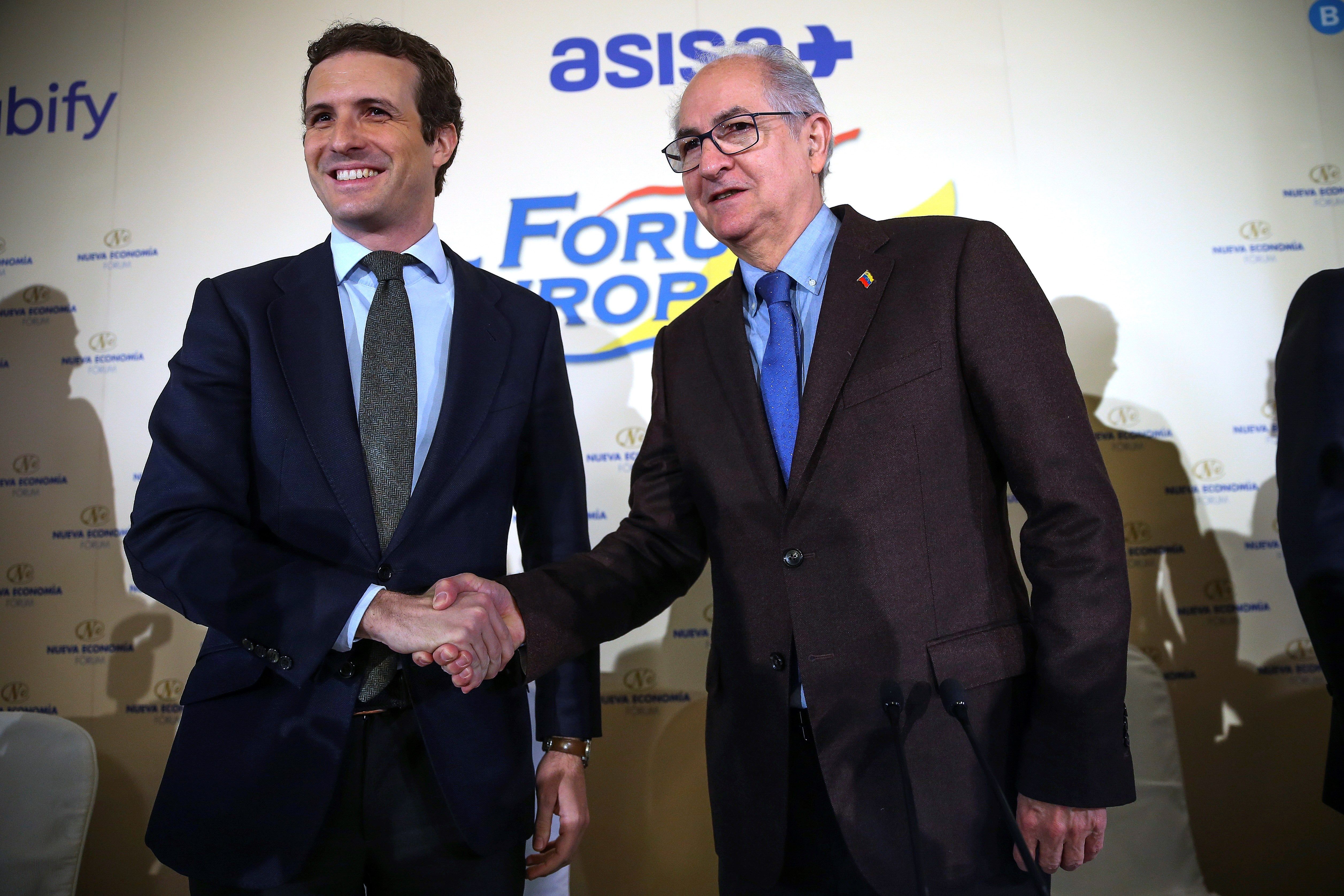 El acto fue presentado por el presidente del PP, Pablo Casado, al que Ledezma pidió que no apoye los "grupos de diálogo" porque eso significaría "dar oxígeno" a Maduro. Por su parte, el líder del Partido Popular lamentó que España no haya estado al frente de las medidas contra el régimen venezolano y "haya desaparecido de la línea internacional".