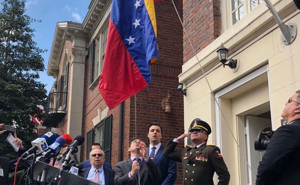 Después de hacer un recorrido por el lugar junto a la prensa, Vecchio izó la bandera de Venezuela en el edificio de la actual agregaduría militar al son del himno nacional, mientras un grupo de activistas gritaba consignas y sostenía pancartas con mensajes como "Las manos fuera de Venezuela".