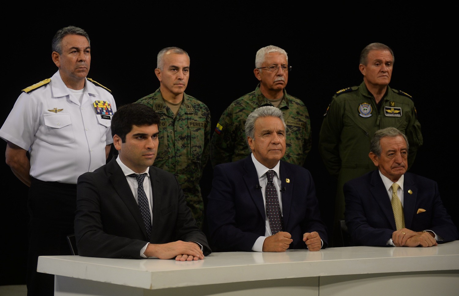 También acompañado de varios jefes militares, el mandatario culpó a Rafael Correa (2007-2017) de estar detrás de los supuestos intentos de desestabilizar a su Gobierno, y le acusó de estar detrás de lo que denominó "intento de golpe de Estado". "Hay –dijo– una intención política organizada para desestabilizar el Gobierno y romper el orden constituido y romper el orden democrático".