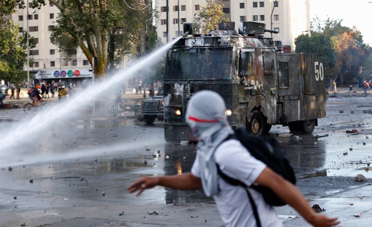 Las tanquetas de agua entraron en acción y desde ese momento las fuerzas del orden trataron de evitar que la situación se saliera de control como ocurrió en los días previos en el centro de la capital chilena, que registró incendios y saqueos sobre locales comerciales. La Policía se desplegó después hacia el sector de Plaza Italia, donde varios miles de personas expresaron su rechazo a la situación de desigualdad social en el país austral.