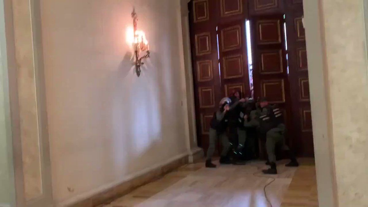 Un grupo de diputados ha aupado a Guaidó, en un aparente intento de saltar la valla de la Asamblea Nacional, algo que ya intentó el domingo, pero los uniformados se lo han impedido a empujones, según imágenes de VPI.