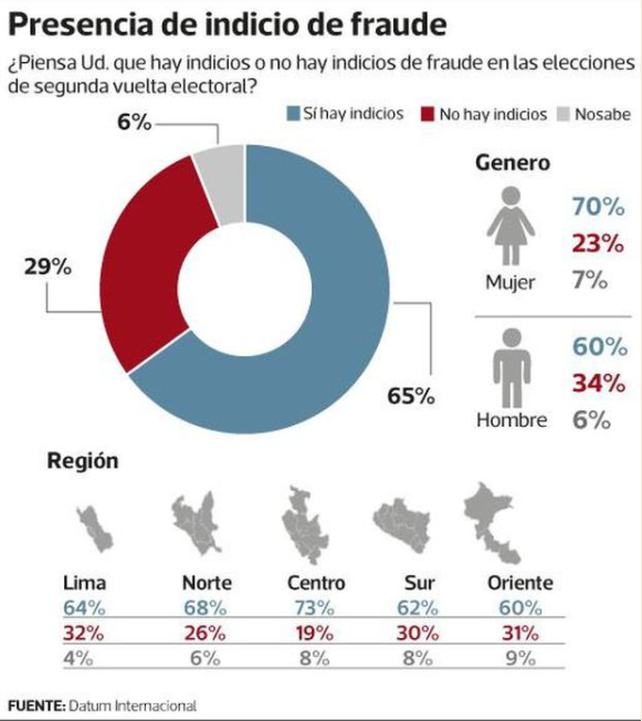 Pero Fujimori no está sola. El 65% de la población peruana considera que existen indicios de fraude electoral en la segunda vuelta, de acuerdo a la encuesta de Datum, difundida en el programa Panorama. El estudio reveló que el 50% de quienes votaron por Pedro Castillo consideran que existen indicios de fraude. Asimismo, el 85% de los votantes de Keiko Fujimori también está convencido de que hubo fraude electoral perpetrado por los comunistas.