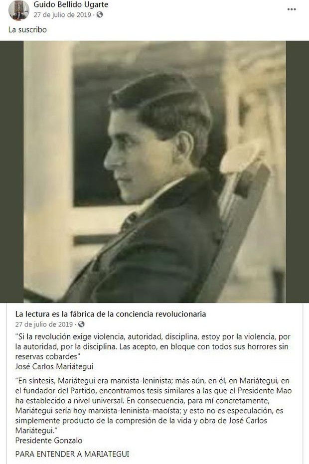 En la publicación compartida por Bellido se señala una cita del escritor y filósofo José Carlos Mariátegui: "Si la revolución exige violencia, autoridad, disciplina, estoy por la violencia, por la autoridad, por la disciplina, las acepto en bloque con todos sus horrores, sin reservas cobardes". Esto fue comentado por Guzmán señalando, entre otras cosas, que "en síntesis, Mariátegui era marxista-leninista".