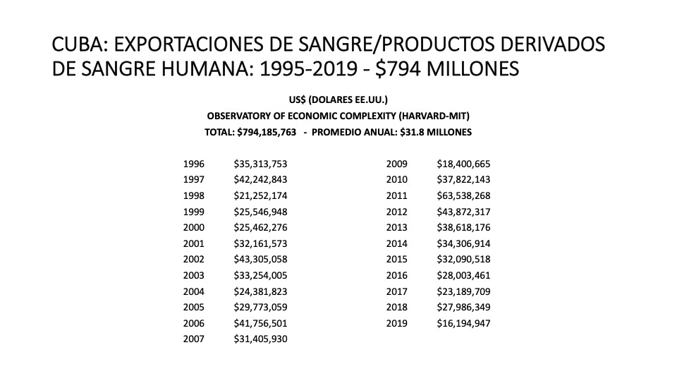 Werlau se ha basado en "las estadísticas de comercio internacional que reportan las Naciones Unidas y recoge un proyecto de MIT (Instituto Tecnológico de Massachusetts) y Harvard", llamado ‘Observatory of Economic Complexity’, que certifica que las exportaciones de sangre y productos derivados reportan a Cuba un promedio de 31,8 millones de dólares al año desde 1995. Pero la venta de material humano comenzó en los primeros años de la revolución cubana con un procedimiento terrorífico.