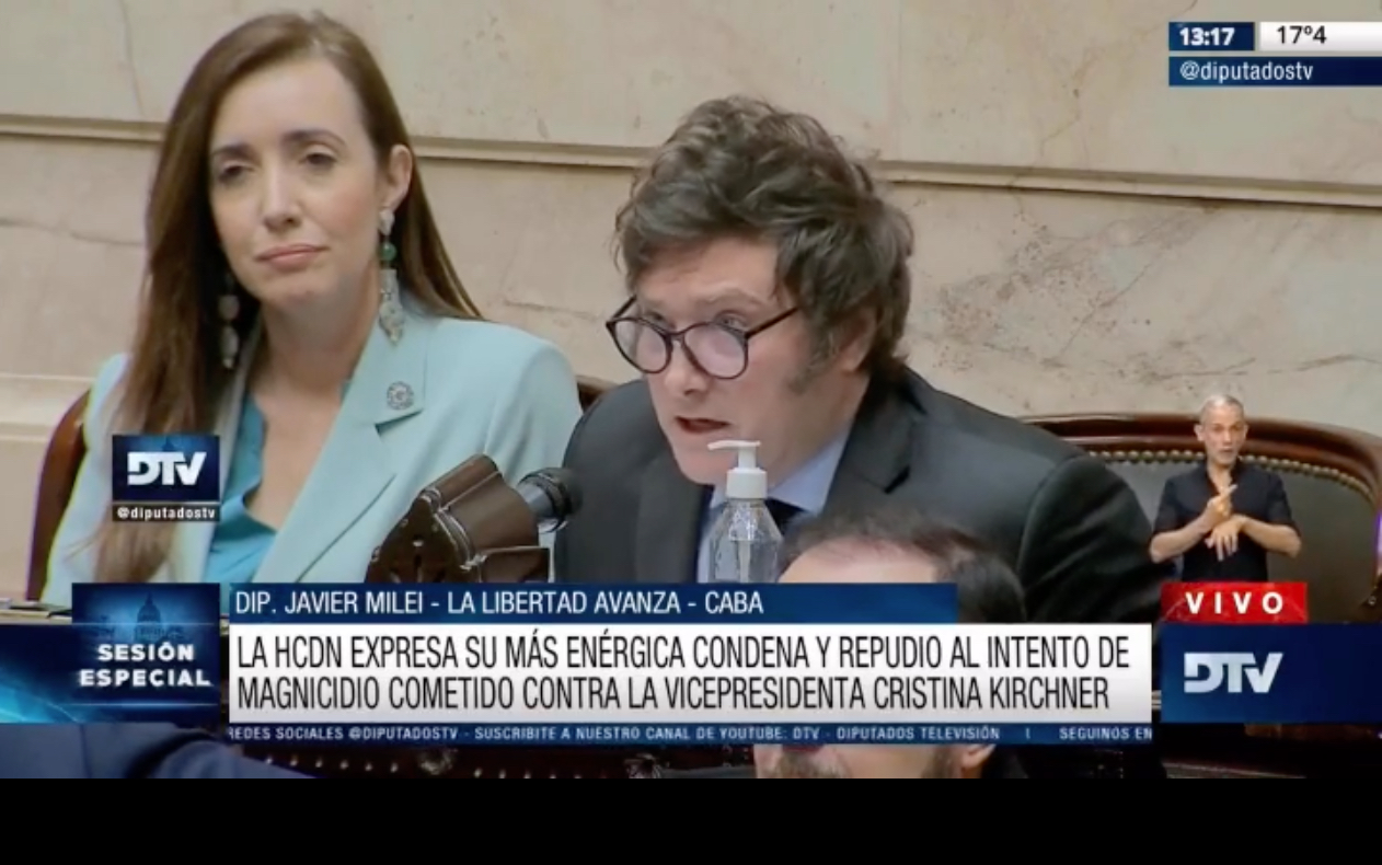 En un durísimo alegato en la Cámara Baja, el liberal Javier Milei ha acusado al Gobierno argentino de la burda utilización del presunto intento de asesinato de la vicepresidenta Cristina Fernández de Kirchner. "Nos parecen lamentables los hechos de los últimos días, donde la política utilizó de manera miserable una situación y un hecho delictivo para armar un rédito político", ha denunciado Milei tras dejar clara su condena de lo sucedido.