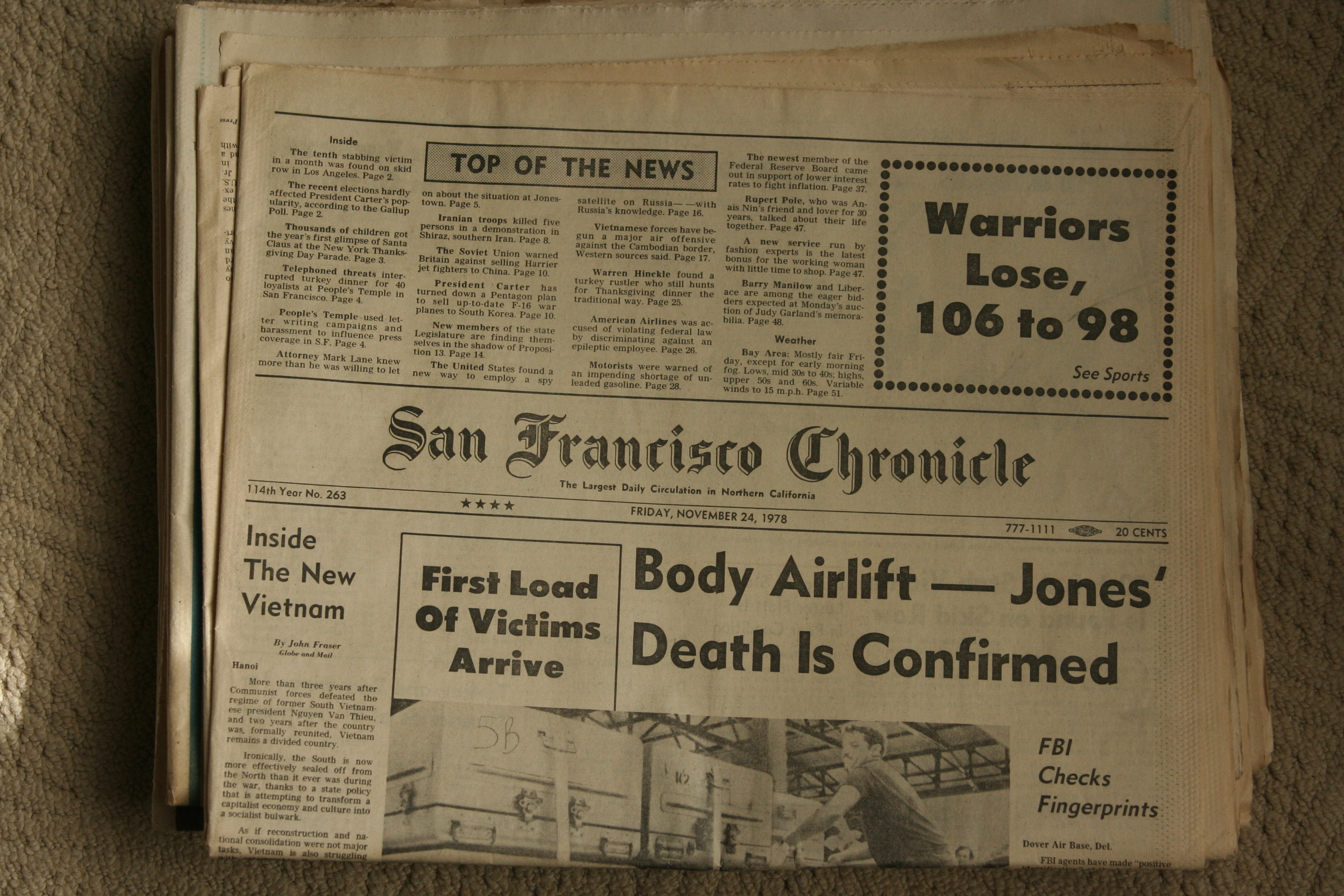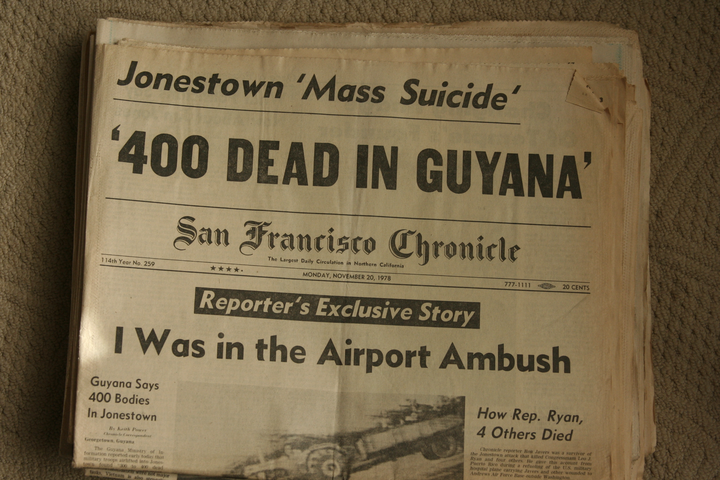 Portada del periódico San Francisco Chronicle, el 24 de noviembre de 1978. Entre los cadáveres hallados en Jonestown tras el “suicidio revolucionario", se encontraba el del líder del grupo -Jim Jones- con un disparo en la cabeza.