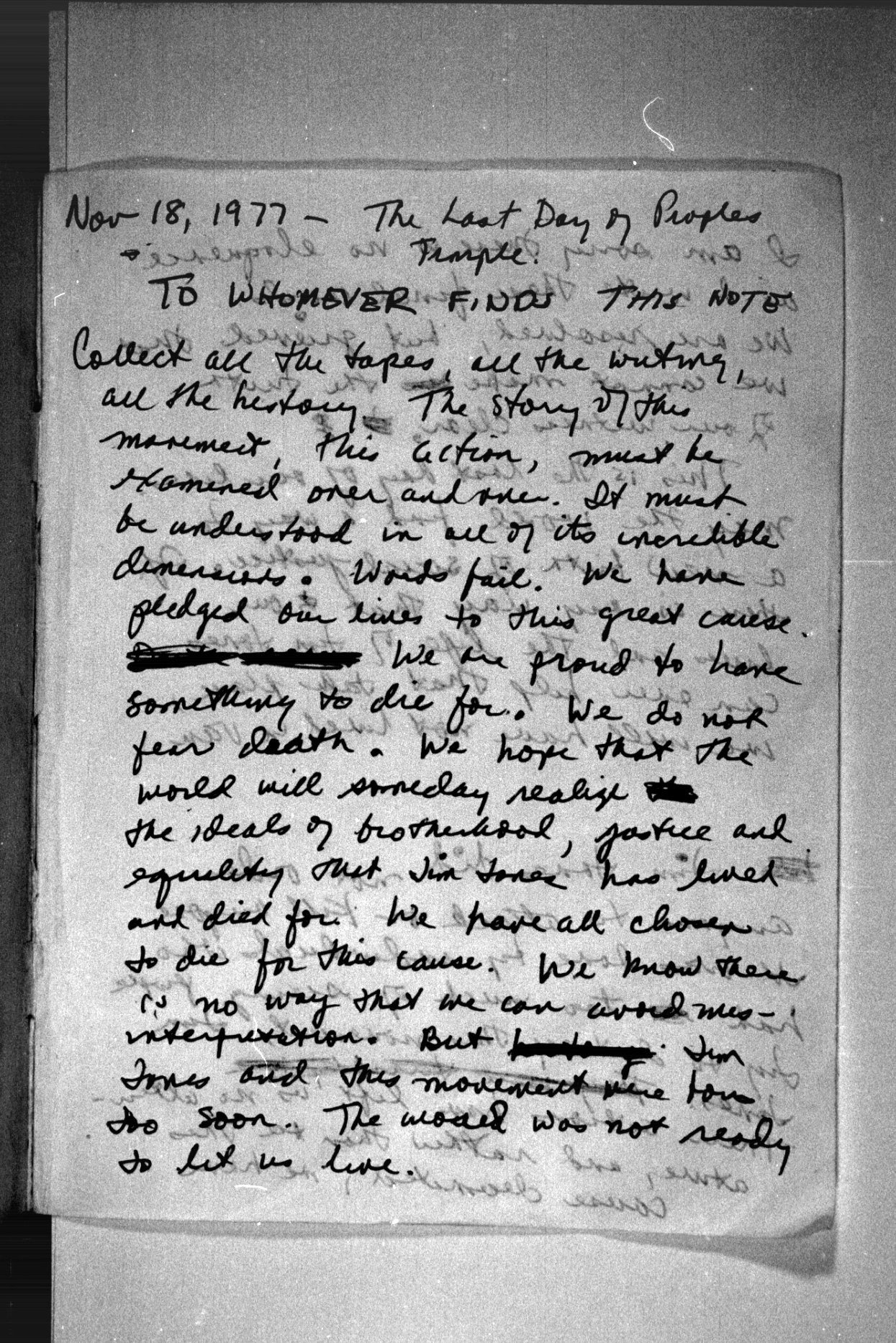 Nota de suicidio, escrita y firmada por la enfermera Annie Moore, una de las líderes del Templo del Pueblo en Jonestown (18 de noviembre de 1978).