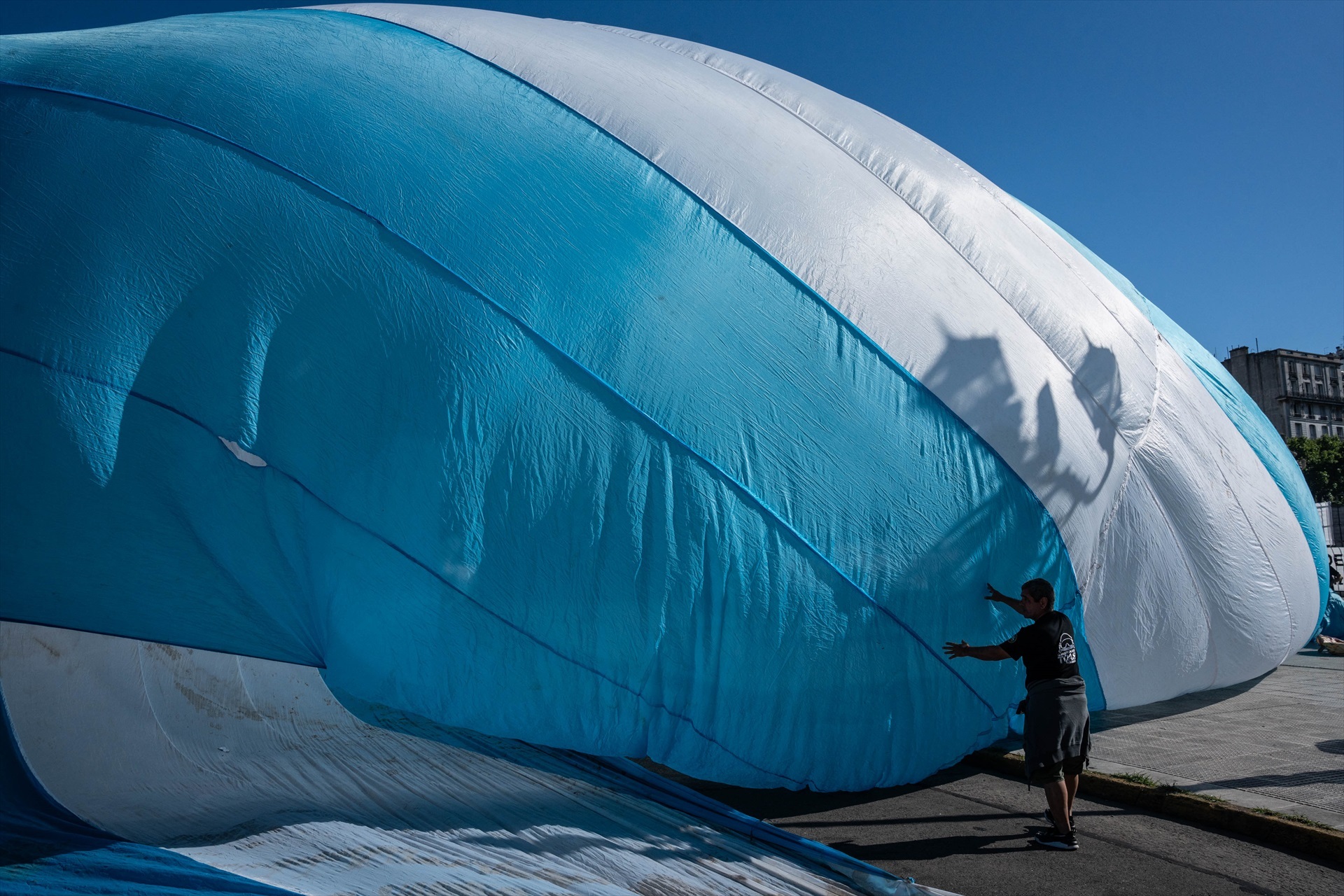Gran bandera de Argentina desplegada en los alrededores del Congreso donde ha tenido lugar la toma de posesión de Javier Milei.