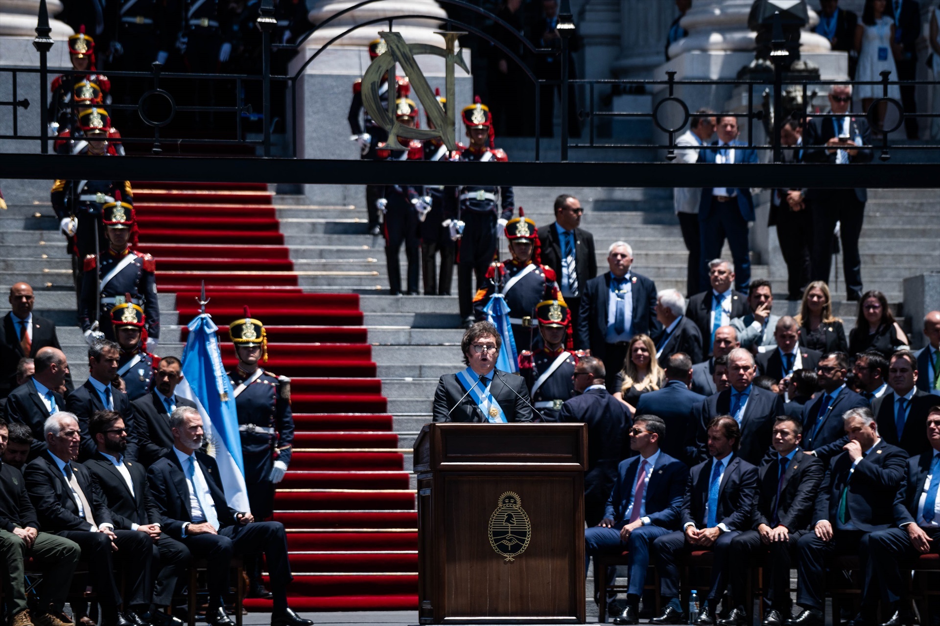 El presidente Milei en un momento de su discurso de investidura. A la izquierda, el rey Felipe VI. El discurso de Milei no ha hecho concesiones a la galería repasando la devastadora herencia del kirchnerismo.