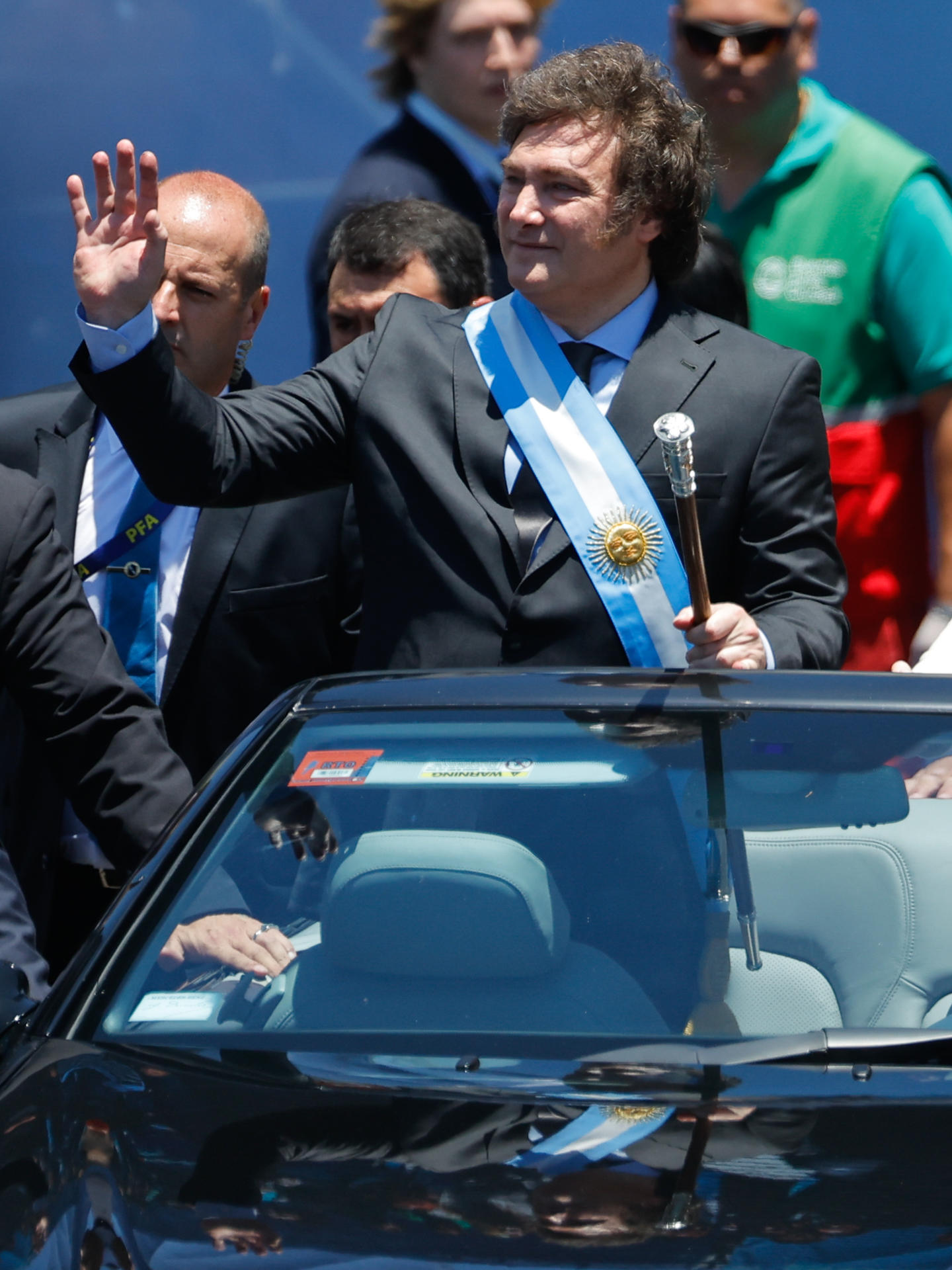 El presidente de Argentina, Javier Milei, se dirige por las calles de Buenos Aires en coche descubierto hasta la Casa Rosada tras su discurso de investidura. A su lado, su hermana Karina Milei.