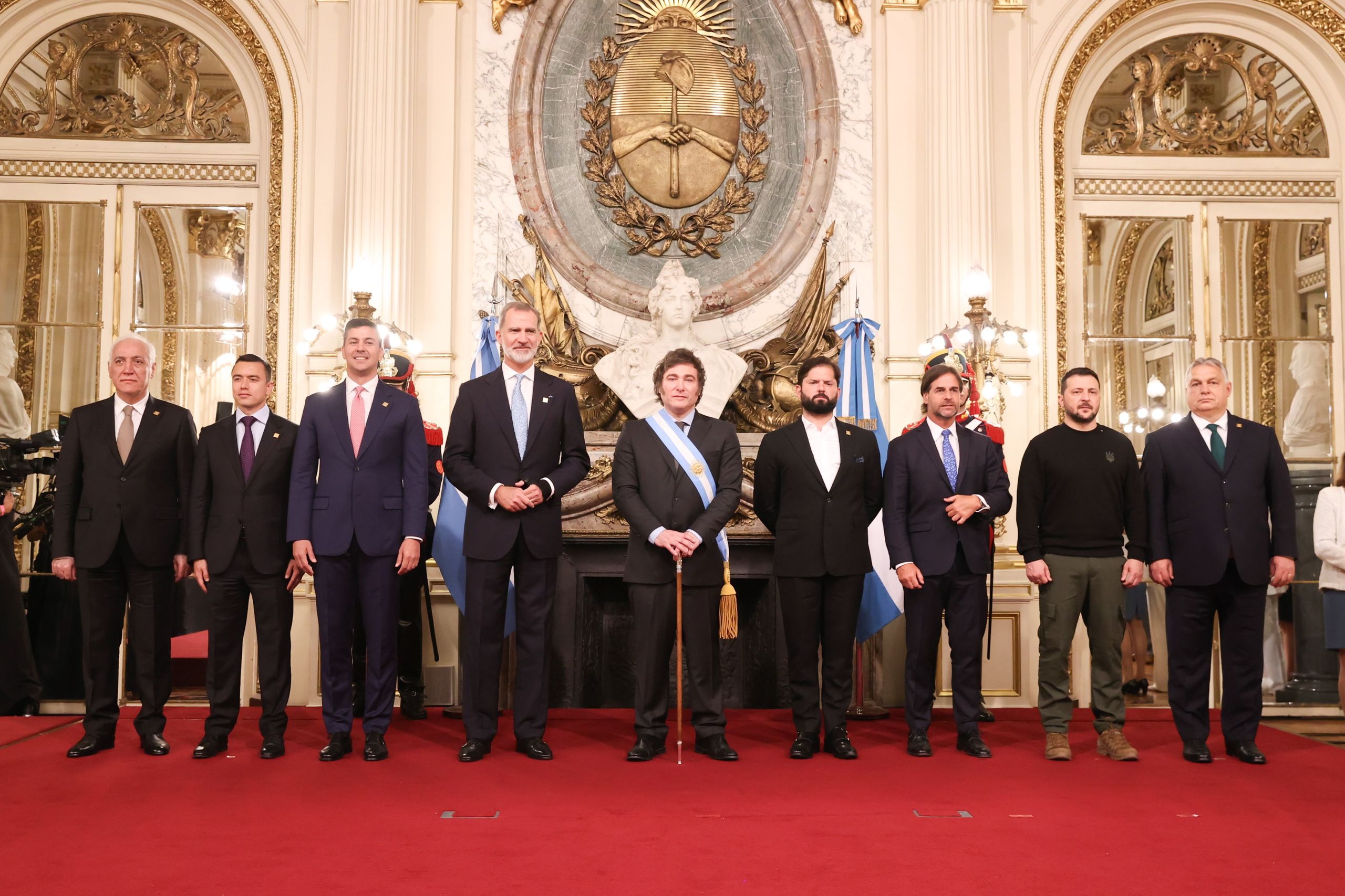 Javier Milei posa en la Casa Rosada tras su toma de posesión rodeado por mandatarios de varios países entre los que se encuentran el rey Felipe VI y Volodomir Zelenski.