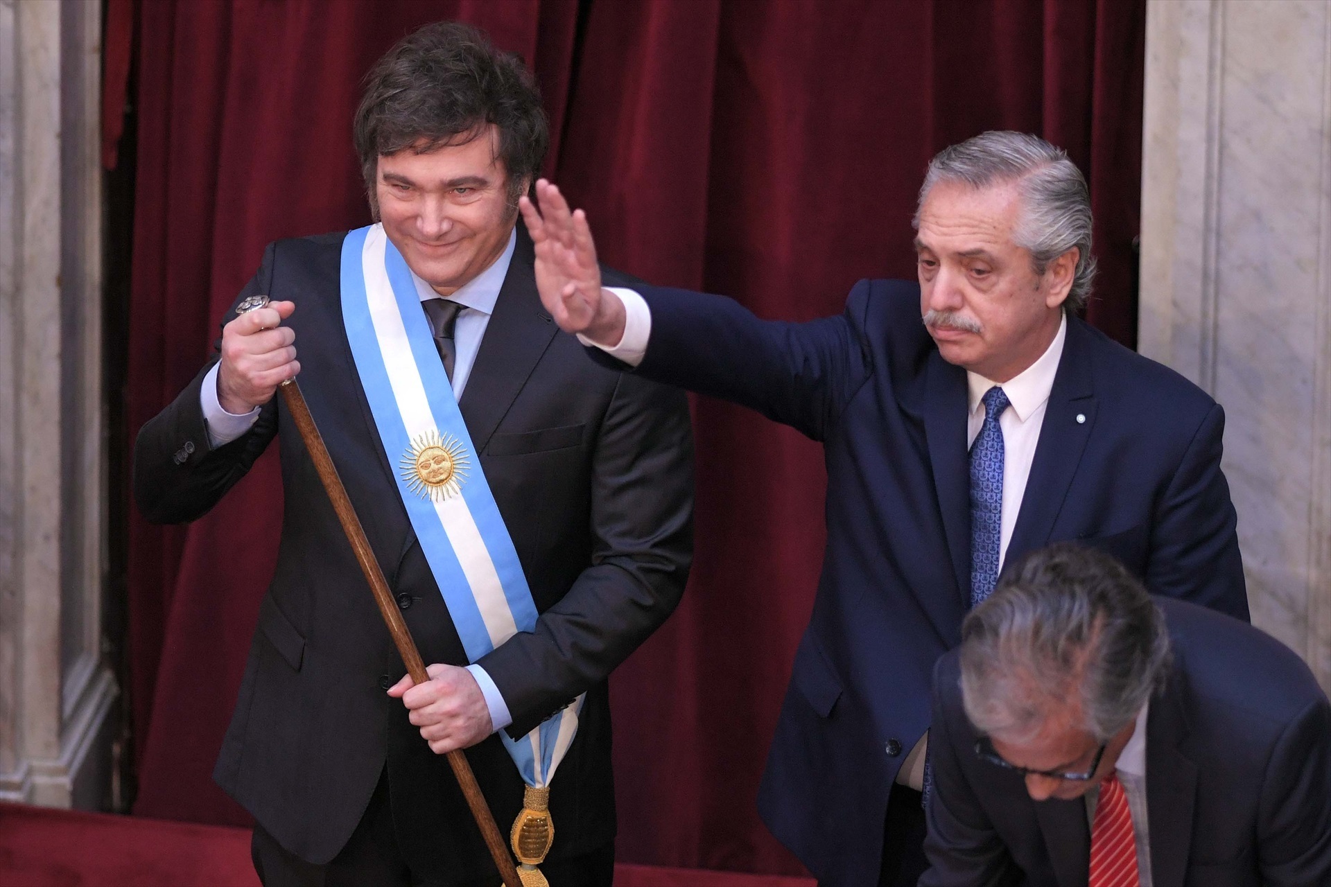 Javier Milei y su antecesor en el cargo, Alberto Fernández, tras la toma del juramento del primero.