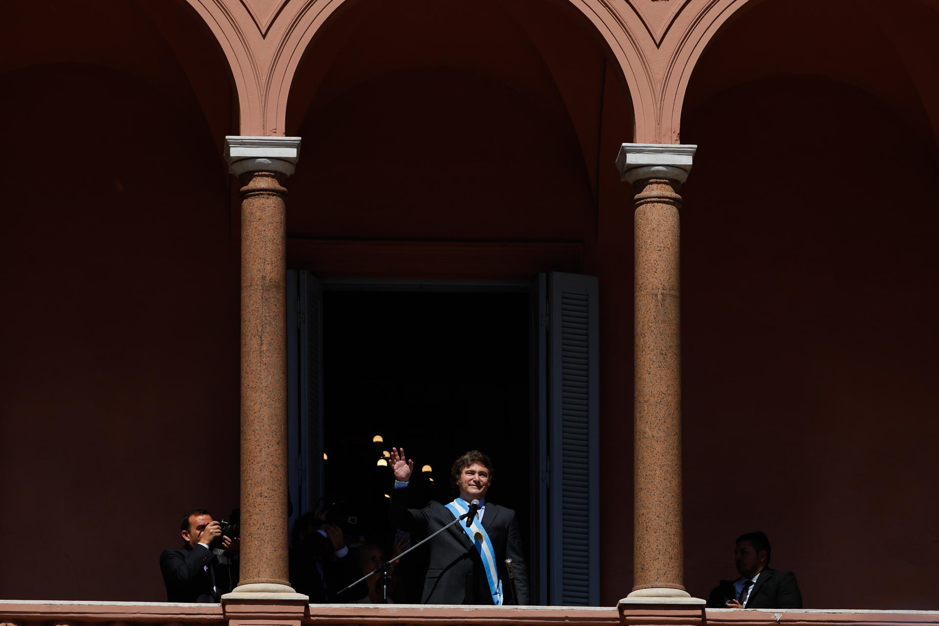 Javier Milei saluda a sus simpatizantes desde el balcón de la Casa Rosada tras haber jurado su cargo como presidente de Argentina.