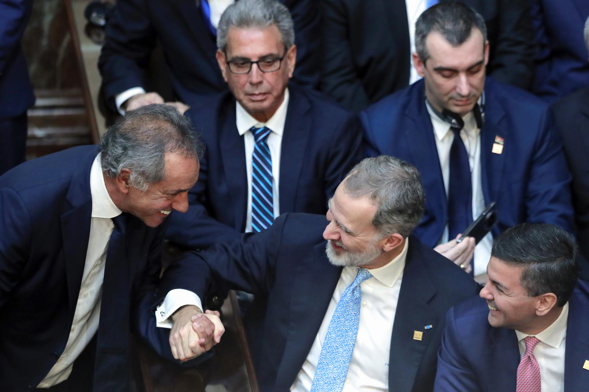 El rey Felipe VI saluda a uno de los asistentes a la jura de Javier Milei. A su derecha, el presidente de Paraguay, Santiago Peña.
