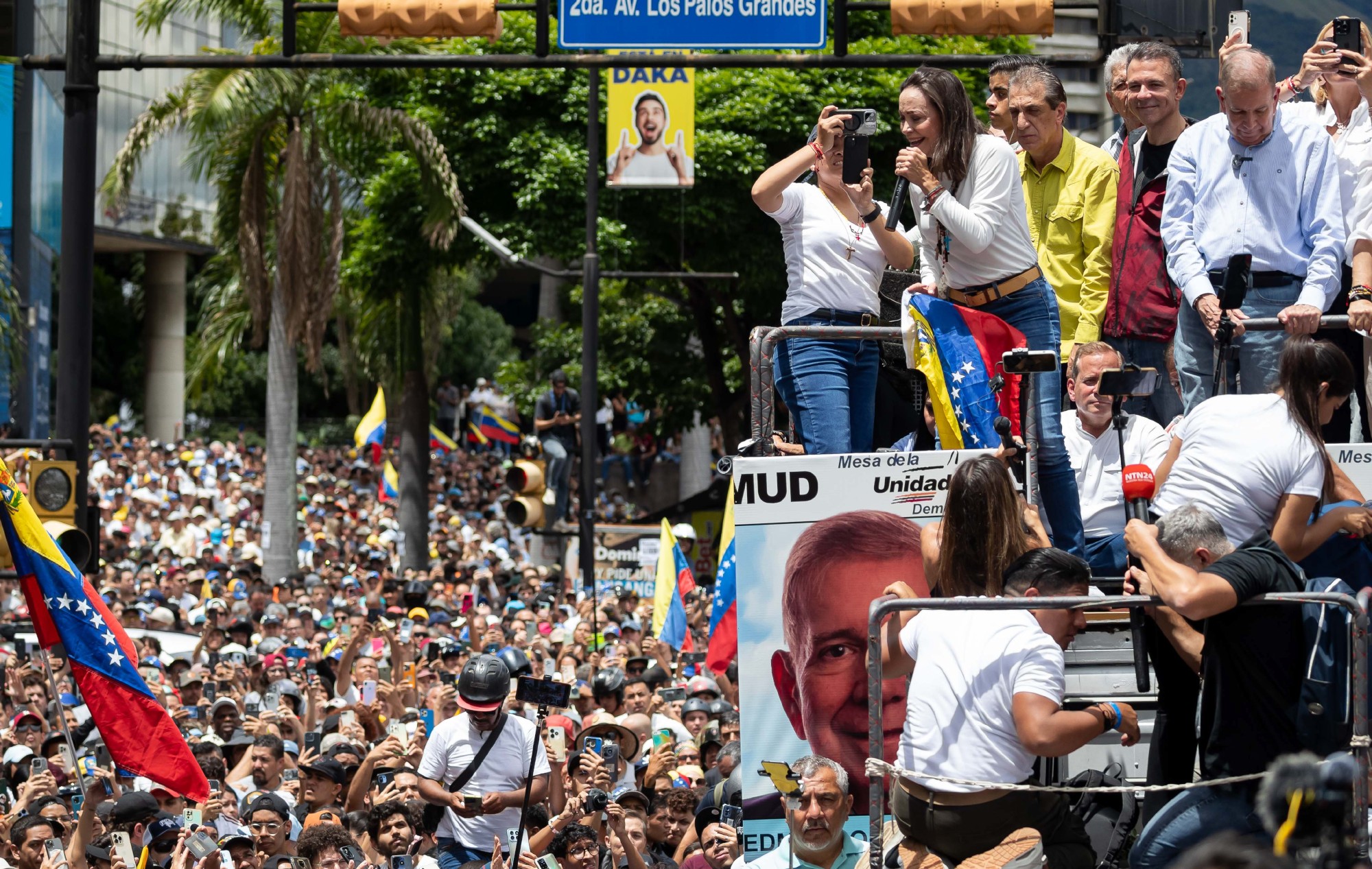 Mayoritariamente vestidos de blanco y coreando consignas contra el chavismo, que gobierna el país desde 1999, los simpatizantes de la Plataforma Unitaria Democrática (PUD) se concentraron en un punto de la ciudad, donde esperaron la llegada de la líder opositora María Corina Machado y del candidato presidencial del bloque antichavista, Edmundo González Urrutia. "¡No tenemos miedo!", gritaban los concentradas.