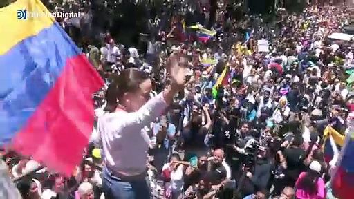 La líder opositora de Venezuela María Corina Machado fue recibida este sábado en la protesta en rechazo a los resultados oficiales de las elecciones presidenciales y el fraude electoral, al grito de "libertad" por miles de personas.