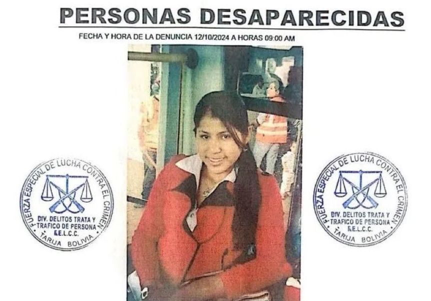 "Desde esa fecha, se desconoce su paradero", reza el comunicado. Cindy Sarai Vargas Pozo (de tez trigueña y cabello de color negro) y su hija de 8 años fueron vistas "por última vez" -recoge la alerta- alrededor de las 18.00 horas del miércoles día 2, cuando se encontraban en las inmediaciones de un colegio adventista de la ciudad de Yacuiba, muy cerca de Argentina.