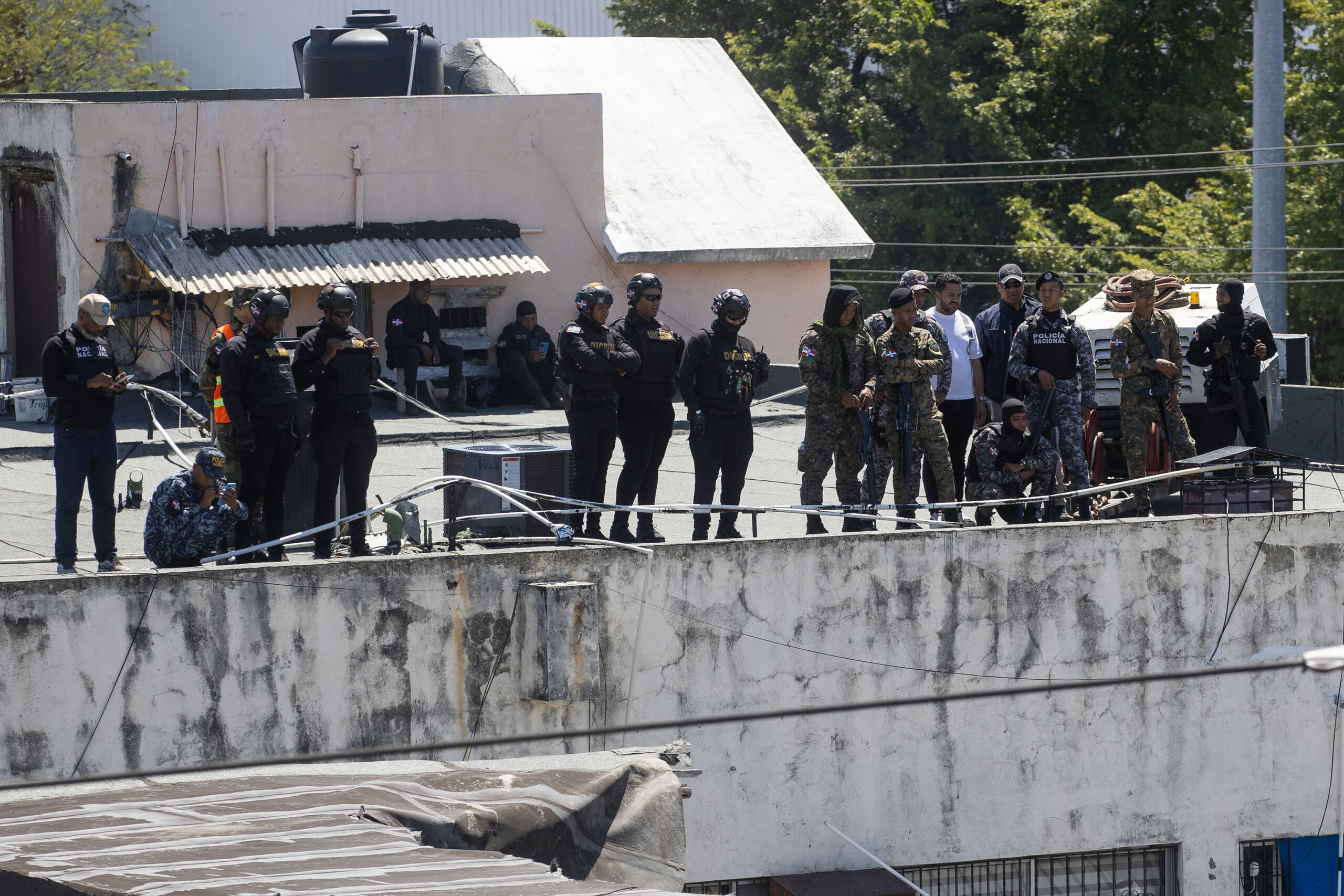 Un grupo miembro de la Policía Nacional dominicana observa la situación desde el techo de un edificio cercano a la discoteca.