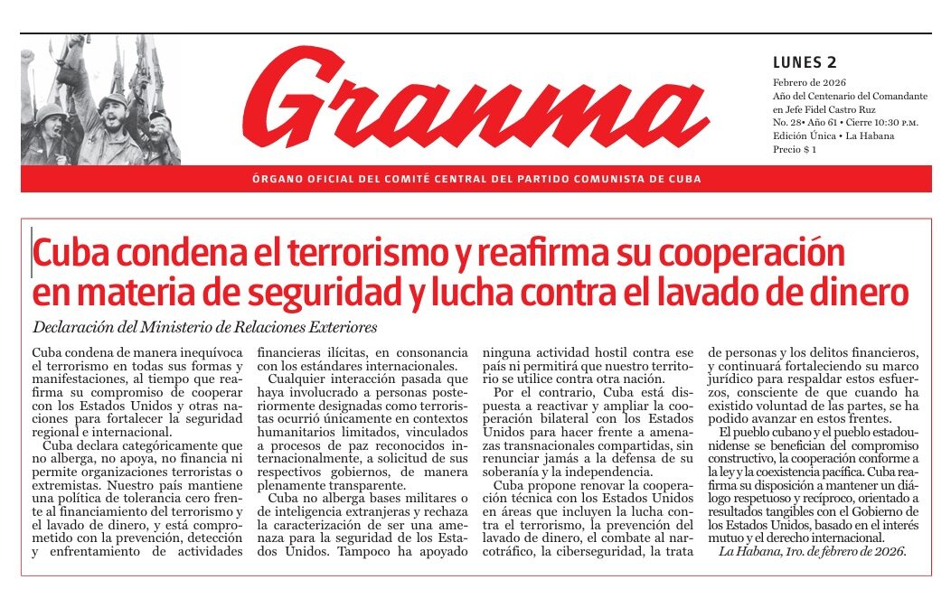 "Cuba condena el terrorismo y reafirma su cooperación en materia de seguridad y lucha contra el lavado de dinero". Este es el titular con el que el periódico Granma —órgano oficial del Partido Comunista Cubano (PCC)— abre la portada de su edición impresa este lunes 2 de febrero de 2026. Se corresponde con el de la declaración difundida este domingo por el ministerio de Exteriores, que reproduce íntegramente y que recoge su "compromiso de cooperar con los Estados Unidos". Algo absolutamente impensable antes de la llegada de Donald Trump a la Casa Blanca.