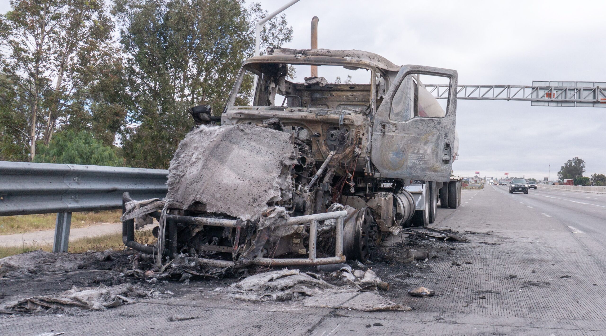 Una camioneta incendiada en la carretera México-Querétaro. Tras el asesinato del narcotraficante Nemesio Rubén Oseguera Cervantes, conocido como "El Mencho", líder del Cártel Jalisco Nueva Generación.