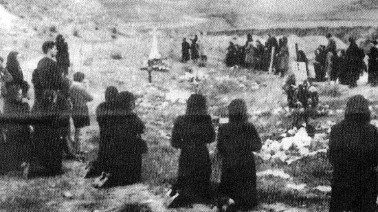 Un grupo de mujeres rezan junto a la fosa común en la que fueron arrojadas las víctimas de la matanza de Paracuellos, perpetrada por la Junta de Defensa de Madrid, controlada por los comunistas. En Paracuellos, cerca de Madrid, fueron asesinadas unas 5.000 personas de manera sumaria. Los ejecutados en Paracuellos no habían cometido ningún delito. Fueron asesinados por razones tales como ir a misa o tener fama de votar a partidos de derecha.