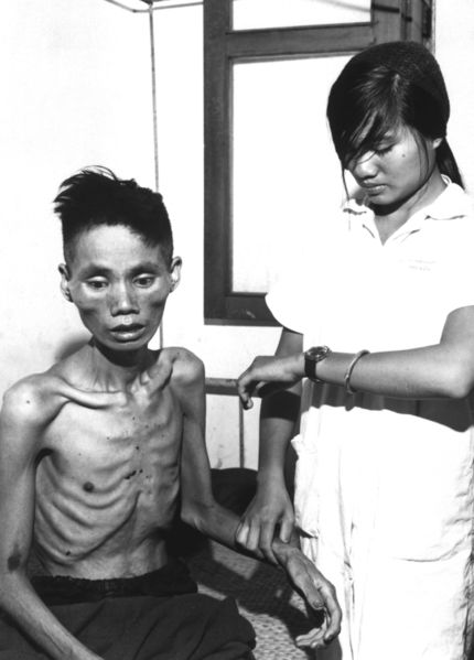 El Vietcong no solía hacer prisioneros pero, si se daba el caso, los concentraba en campos y los dejaba morir de hambre. Los Estados Unidos denunciaron estas prácticas pero, en pleno fragor de la guerra, con la URSS alimentando la propaganda antiamericana, nadie escuchó. En la imagen un norvietnamita que, tras pasarse al lado americano, fue recapturado por el Vietcong y castigado a morir de hambre. El ejército norteamericano le rescató posteriormente salvándole así la vida.