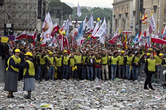 Voluntarios ayuda en el control de masas en la plaza de San Pedro, Ciudad del Vaticano, hoy domingo 01 de mayo de 2011