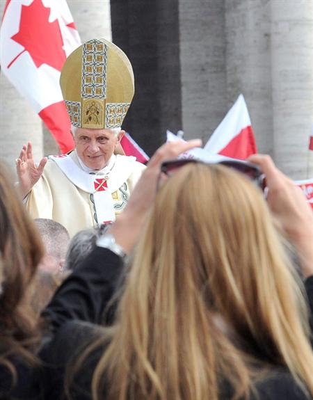 El papa Benedicto XVI saluda a los fieles antes del comienzo de la ceremonia de beatificación del papa Juan Pablo II
