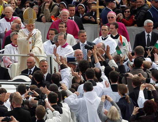 El papa Benedicto XVI saluda a jóvenes sacerdotes a su llegada a la ceremonia de beatificación del papa Juan Pablo II