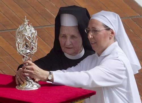 Las hermanas Tobiana y Marie Simon Pierre tocan el relicario que contiene la sangre del papa Juan Pablo II, durante la ceremonia de beatificación oficiada por el papa Benedicto XVI en la plaza de San Pedro del Vaticano, hoy, domingo, 1 de mayo de 2011