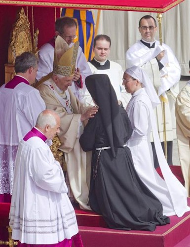 El papa Benedicto XVI bendice a las hermanas Tobiana y Marie Simon Pierre durante la ceremonia de beatificación del papa Juan Pablo II celebrada en la plaza de San Pedro