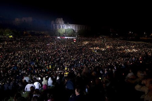 Feligreses católicos asististieron el sábado 30 de abril de 2011, en Circo Massimo, centro de Roma, a la noche de vigilia previa al evento del domingo.