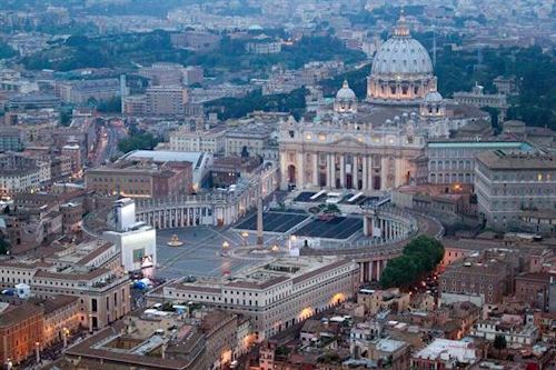 Vista aérea panorámica de los alrededores de la Plaza de San Pedro en Ciudad del Vaticano el sábado 30 de abril, la noche previa a la ceremonia. EFE//Massimo Sestini