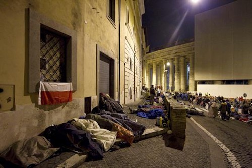 Varias personas acampan en la Vía della Conciliazione esta madrugada para guardar sitio para la beatificación del papa Juan Pablo II.