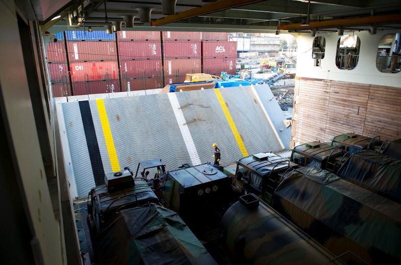 El Ejército francés descarga parte de los camiones de transporte desplazados hasta Mali en barco en el puerto de Dakar, en Senegal.
