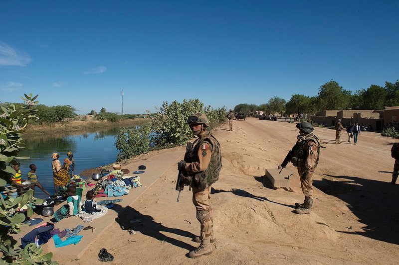 Infantes de Marina franceses, en un poblado maliense, entre las ciudades de Markala et Diabali