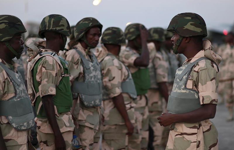 Un militar francés, junto a un soldado de Costa de Marfíl y varios militares africanos más.
