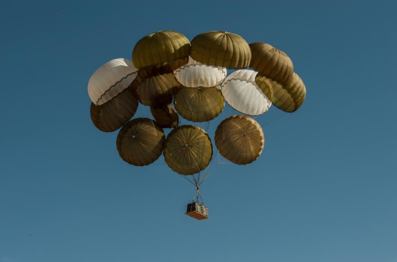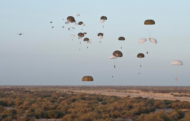 Militares franceses del 17 Regimiento de Paracaidistas y diverso material militar caen sobre suelo maliense, en las cercanías de la ciudad de Tombuctú.