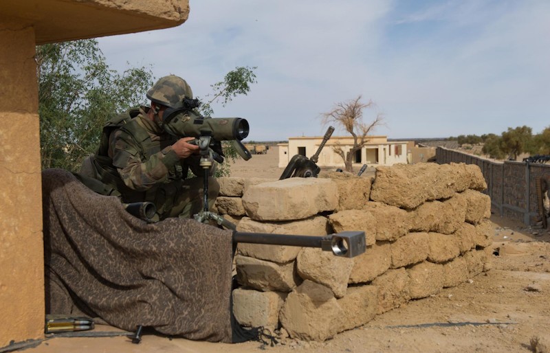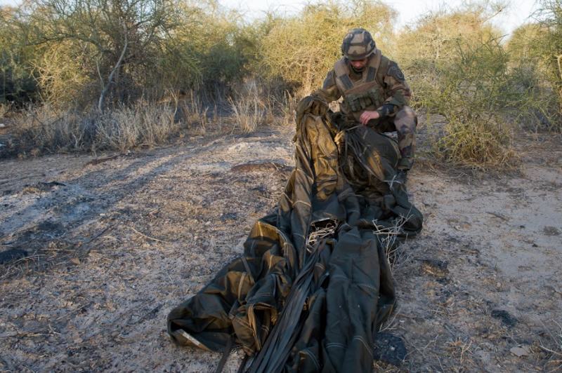 Un paracaidista francés junto a las instalaciones del aeropuerto de Tissalit.