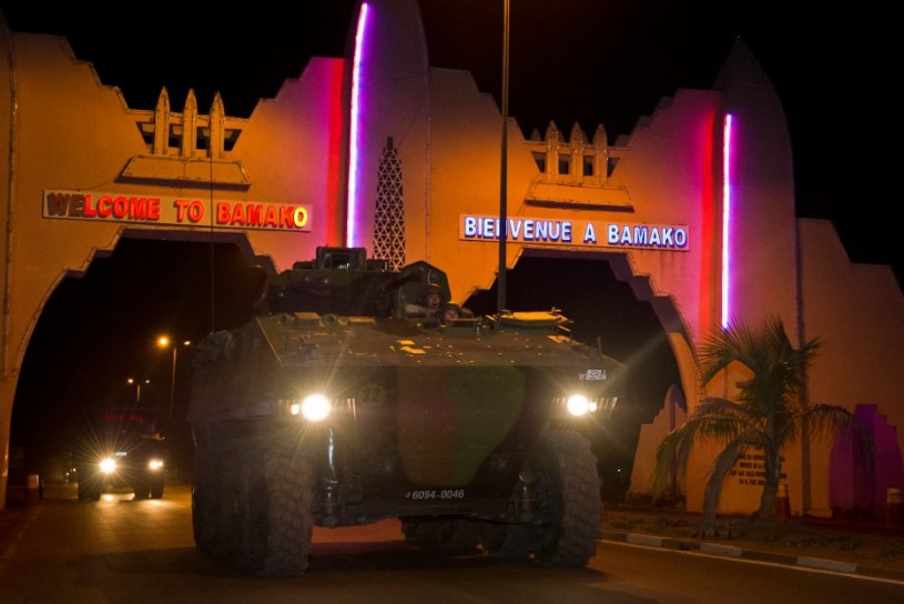 Un vehículo blindado de combate todo terreno de ocho ruedas VBCI, perteneciente al Regimiento de Infantería 92, en una de las entradas a la ciudad de Bamako.