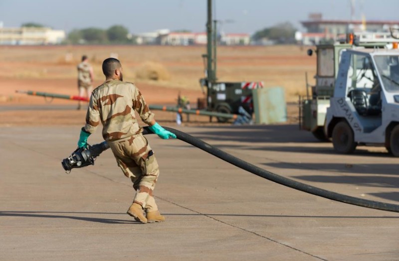 Un militar francés, en el aeropuerto de Bamako, mueve una de las mangueras que abastecente a los cazas Mirage 2000 que atacan posiciones islamistas en el norte de Mali.