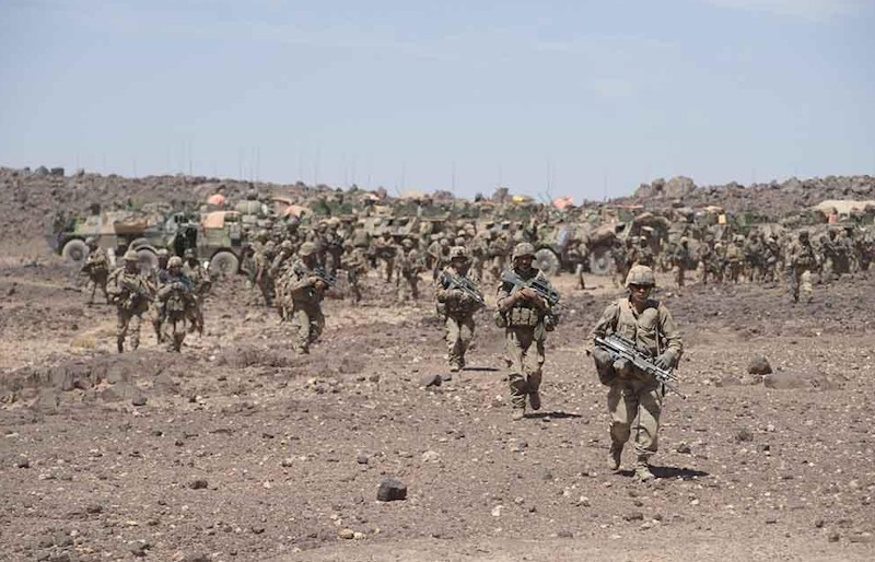 Militares del 21 Regimiento de la Infantería de Marina francesa avanzan hacia el norte de Mali para reconquistar la ciudad de Diabali.