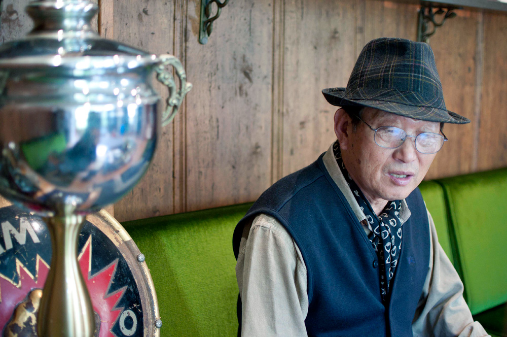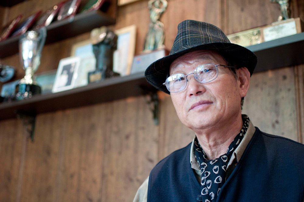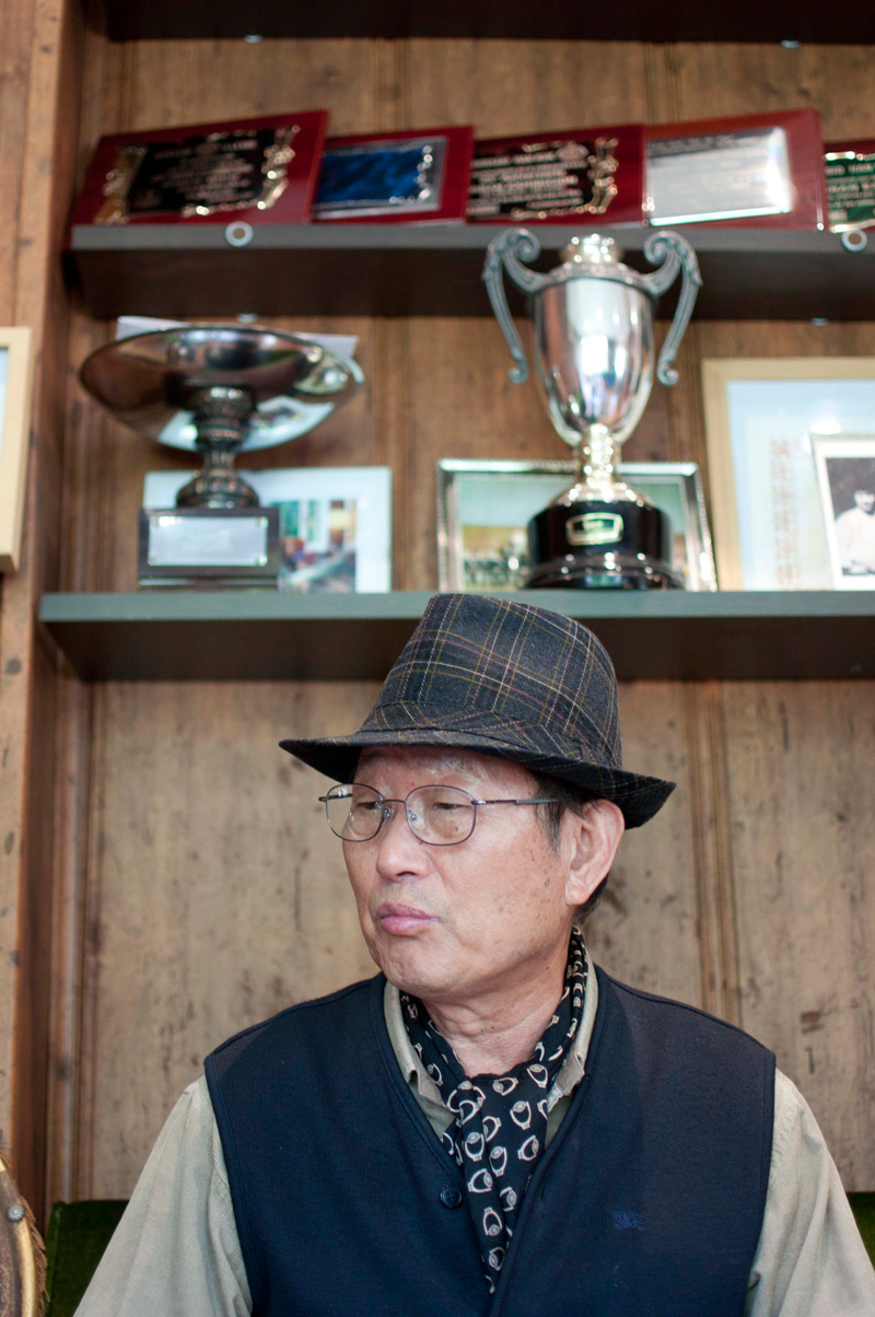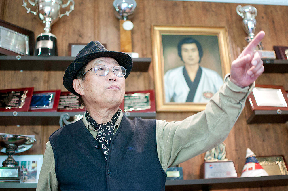 El gimnasio está plagado de recuerdos de toda una vida consagrada al arte marcial. Detrás de él, un retrato de Kim Jae Won de joven.