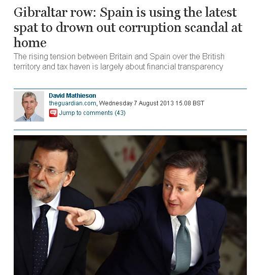 "España está usando la última disputa para tapar el escándalo de corrupción", titula el periodista de The Guardian, David Mathieson. El artículo detalla el escándalo Bárcenas y afirma que una de las claves del conflicto es la transparencia financiera, mientras recuerda que el Peñón goza de un status de paraíso fiscal.