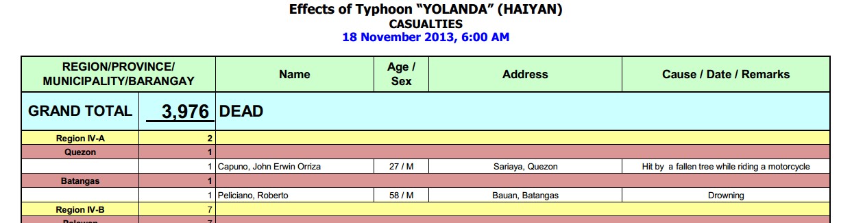 Las autoridades de Filipinas elevaron este lunes a 3.976 el balance provisional de muertos provocados por el tifón Haiyan en la región central del país. En su último informe, el Consejo Nacional de Gestión Reducción de Riesgo de Desastres ha elevado también a 18.175 el número de heridos y a 1.598 el de los desaparecidos.