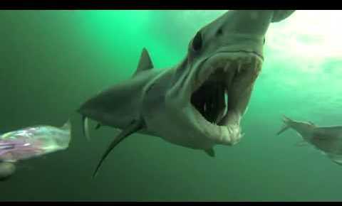 Increíbles imágenes subacuáticas captadas con una cámara GoPro de alta definición, en las que se ve cómo un tiburón desesperado busca su almuerzo en los cebos colocados bajo la embarcación.