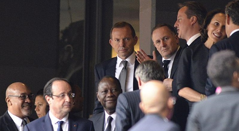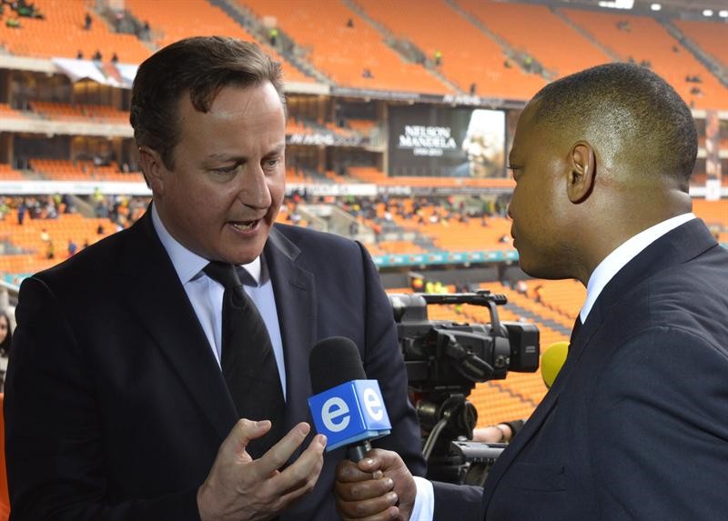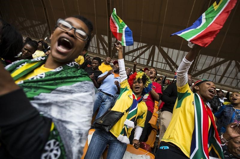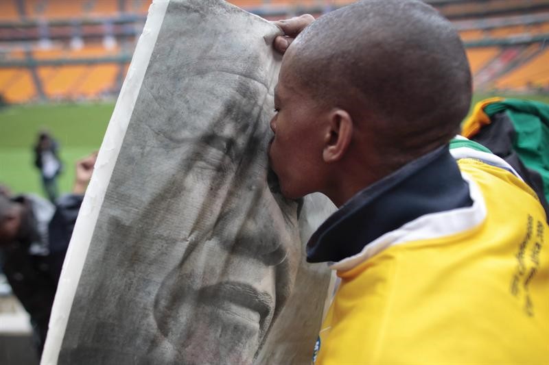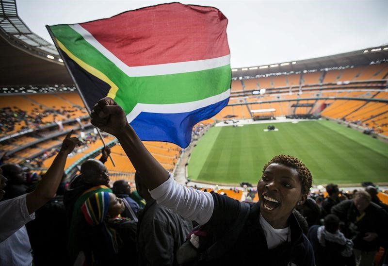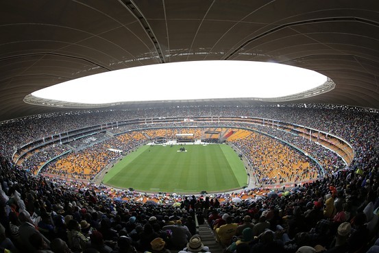 Una multitud de sudafricanos canta y baila mientras ocupa el estadio FNB de Soweto para asistir al servicio religioso oficial en memoria del expresidente Nelson Mandela en Johannesburgo.