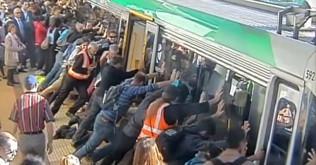 Decenas de viajeros ayudan a rescatar a un pasajero en la ciudad de Perth, en Australia, empujando un vagón de metro para liberar su pierna, que había quedado atrapada entre la plataforma y el transporte. Después de unos segundos, el hombre atrapado pudo ser rescatado por los efectivos de seguridad del transporte y la fuerza conjunta de todos los ciudadanos solidarios. Al final, un aplauso de satisfacción.