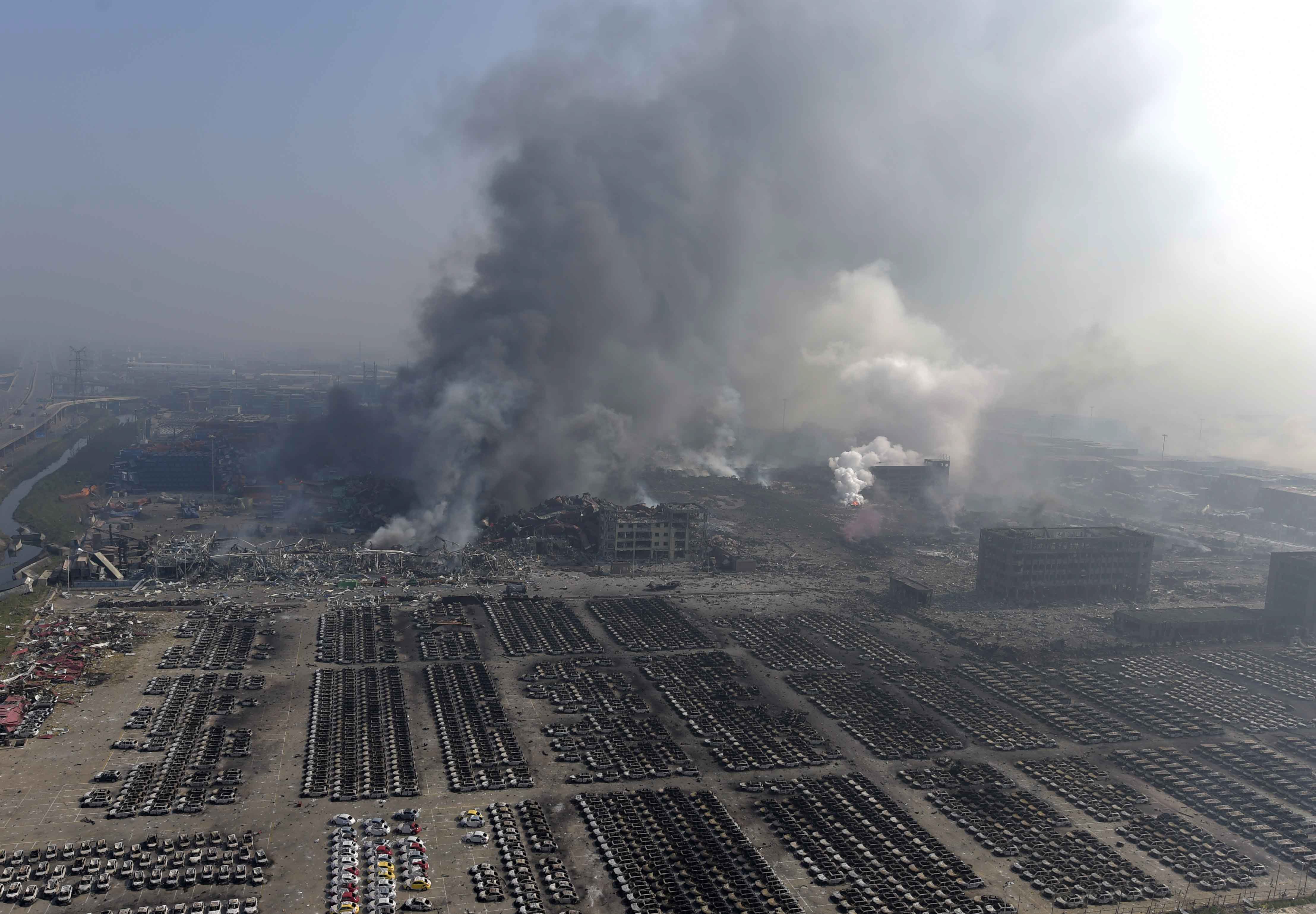 Horas después de la explosión una gigantesca cortina de humo seguía elevándose desde el puerto de Tianjin