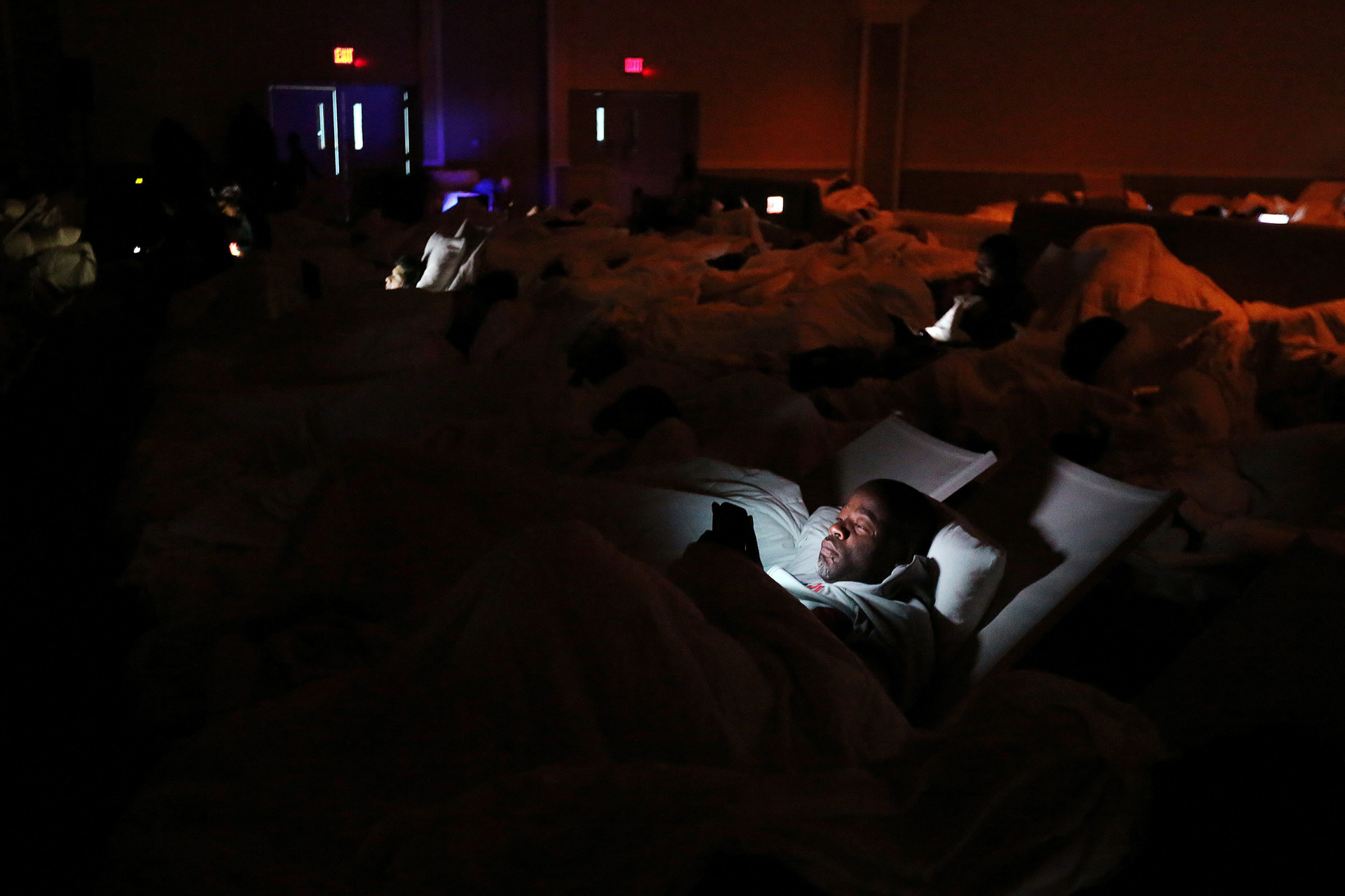 Un hombre lee las últimas noticias sobre el huracán Matthew en su teléfono móvil refugiado en el interior del hotel Melia en Nassau, Bahamas.